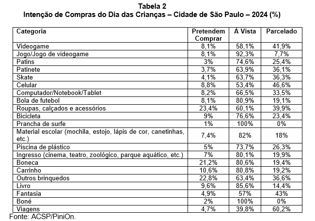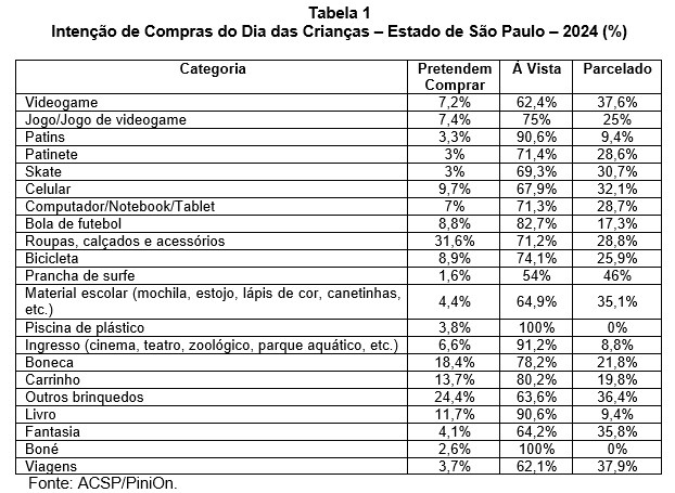 Em geral, tal como ocorreu em nível nacional, nas intenções de compra manifestadas predominam itens tradicionais para esta data, como roupas, calçados e acessórios (31,6%), boneca (18,4%), bola de futebol (8,8%), bicicleta (8,9%) e carrinho (13,7%).