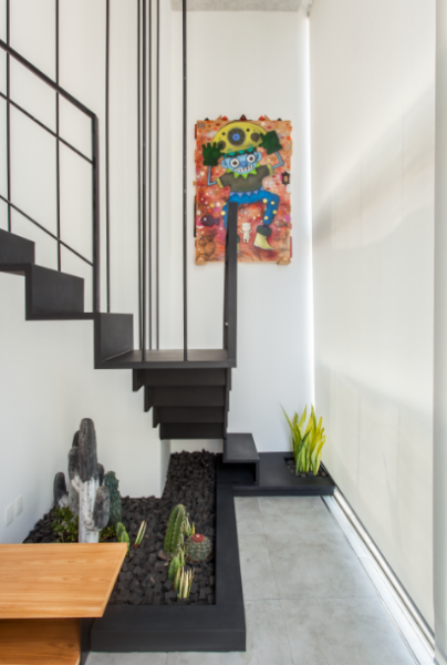 A área sob a escada é um exemplo clássico de um espaço que, quando bem aproveitado, pode ser extremamente funcional. As arquitetas recomendam o uso desse local para soluções sob medida, como estantes e prateleiras, que ajudam na organização do ambiente. “Além disso, se o espaço for grande, é possível instalar armários para guardar itens como roupas de cama ou calçados”, explica Ieda. Outra alternativa é a criação de um pequeno jardim interno, que traz um toque natural ao ambiente. No caso de um loft, como o de um de seus projetos, o jardim com pedras é um detalhe que se destaca, combinando natureza e sofisticação.