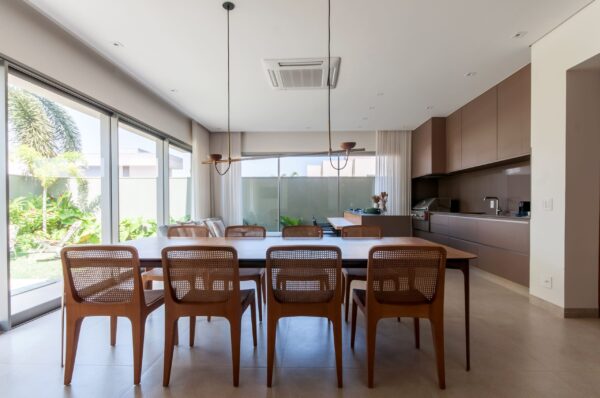 A simplicidade da mesa de vidro permite que ela se integre em diferentes propostas de sala de jantar, tornando-a ideal para áreas amplas ou espaços que buscam explorar a amplitude. Nesse projeto, as arquitetas Vanessa Paiva e Claudia Passarini elegeram um modelo composto pelo vidro tanto na estrutura, como em sua base | Projeto do escritório Paiva e Passarini Arquitetura | Xavier Neto
