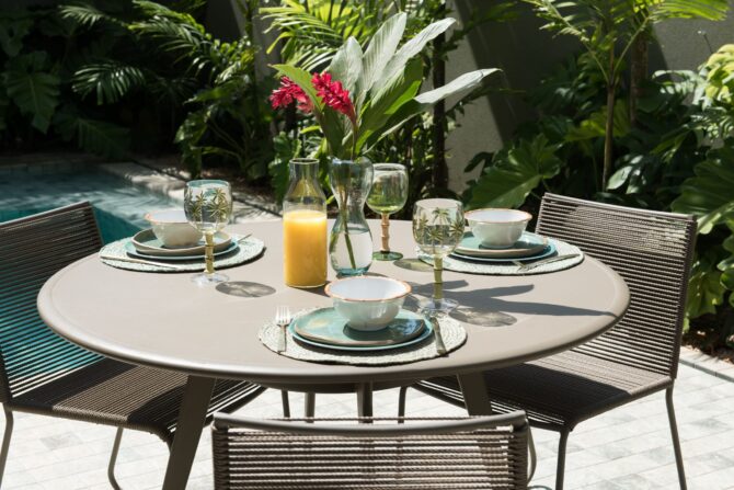 Materiais sintéticos com alumínio são perfeitos para áreas externas. “É muito importante considerar que a estabilidade e longevidade são decorrentes da resistência à exposição dos móveis ao sol, chuva e umidade“, analisa Claudia. São simples para higienizar, duradouros ao desbotamento ocasionado pelos raios UV e sua superfície lisa é confortável para apoiar copos, pratos e outros itens.
