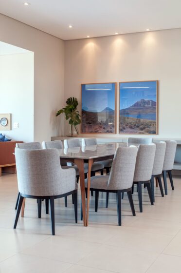 Nessa sala de jantar, as profissionais Vanessa Paiva e Claudia Passarini selecionaram uma mesa com estrutura de madeira e sua base de pedra lapidada executada sob medida
