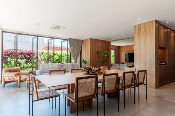Nessa sala de jantar, as profissionais Vanessa Paiva e Claudia Passarini selecionaram uma mesa com estrutura de madeira e sua base de pedra lapidada executada sob medida