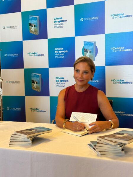 A atriz e humorista Heloisa Périssé sensibilizou e divertiu o público durante a divulgação do livro “Cheia de Graça: Uma jornada de humor, amor e cura”, realizado nesta terça-feira (11), em Salvador, no auditório da unidade Ondina. O evento, promovido pela Oncoclínicas, na Bahia, reuniu pacientes oncológicos e médicos da unidade Ondina, em uma tarde para celebrar os cinco anos de cura da atriz.