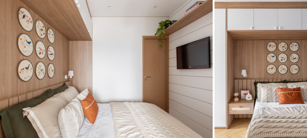 No quarto principal, a marcenaria planejada foi utilizada para otimizar o espaço, com um guarda-roupa suspenso que permite uma circulação mais fluida. Um painel de madeira clara complementa a decoração, mantendo o ambiente leve e acolhedor. Um detalhe que chama atenção são os bastidores com bordados de passarinhos, um pedido especial da proprietária, que traz um toque afetivo e único ao ambiente.