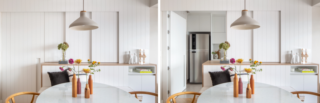 A cozinha aberta, que pode ser isolada por portas de lambri em laca branca, foi pensada para manter a flexibilidade do espaço, de acordo com as necessidades da moradora. A bancada fixa também complementa a funcionalidade do ambiente, ideal para refeições rápidas e como área de apoio na preparação dos pratos. “O design clean e a funcionalidade se encontram na combinação de materiais simples, mas sofisticados”, explica Daniela Miranda.