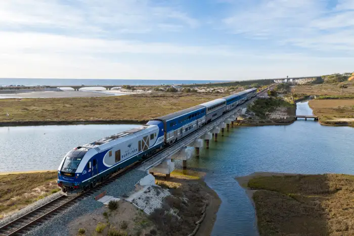 + O Pacific Surfliner da Amtrak oferece belas vistas costeiras ao longo de rotas para 29 estações nos condados de Los Angeles, San Diego, Orange, Ventura, Santa Bárbara e San Luis Obispo – além de Wi-Fi, outlets, um café e, para viajantes a negócios, uma lancheira de cortesia .
