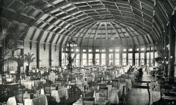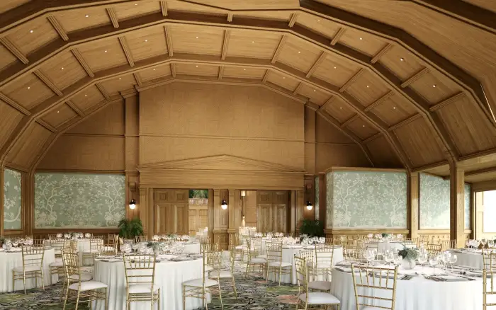 Uma entrada totalmente nova permite o mesmo grande momento de chegada vivido pelos hóspedes originais que pararam em cavalos e charretes. A conclusão do proeminente edifício vitoriano em 2025, com quartos de hóspedes, salas de reuniões e banquetes (o Crown e o Coronet, a serem inaugurados neste verão) e dois próximos restaurantes (incluindo um Nobu), será a última etapa da renovação. Mas o grande lobby de madeira – com madeira de carvalho descascada de Illinois e lustres deslumbrantes – já foi refeito para levar a propriedade de volta à aparência da década de 1880.