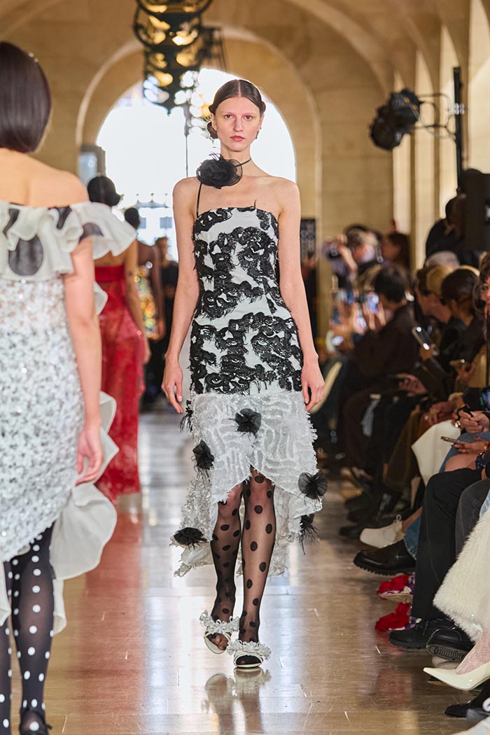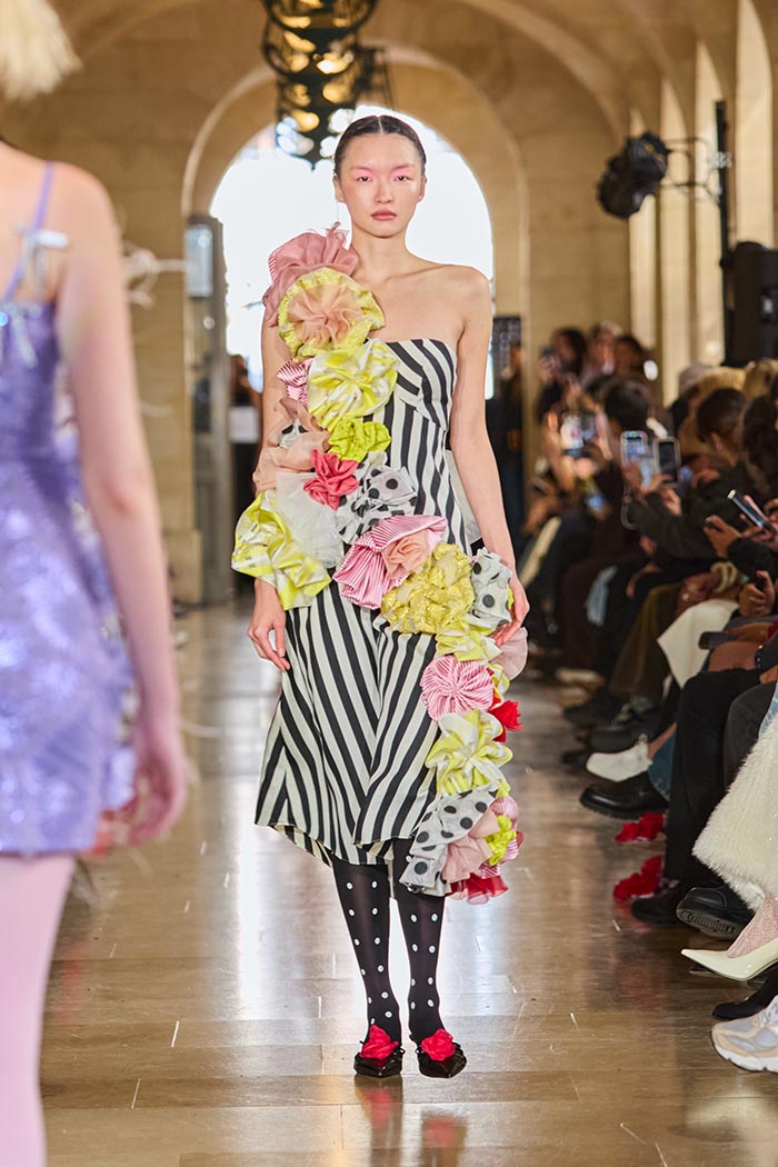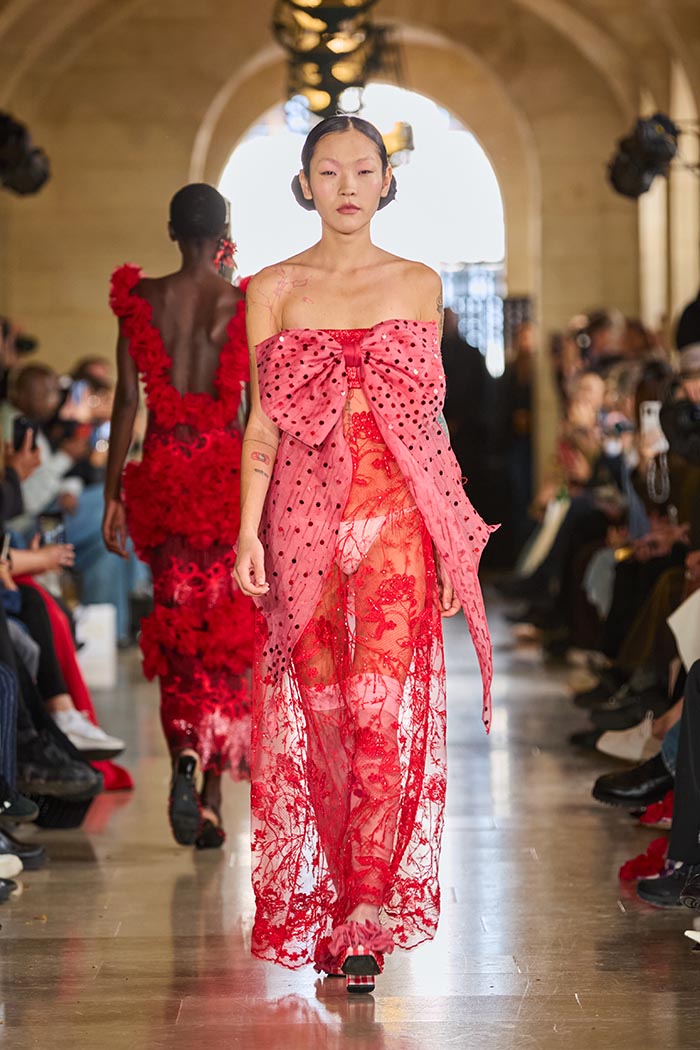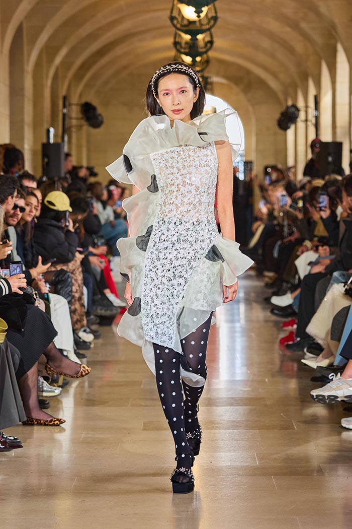 Em meio a essa paleta vibrante, o preto e o branco surgem como contrapontos dramáticos, simbolizando sombra e luz, força e vulnerabilidade. Qiu conduz essa dualidade com maestria, equilibrando o lúdico e o sofisticado, o artesanal e o experimental. Os laços, flores em relevo e transparências revelam um diálogo entre tradição e modernidade, onde cada detalhe se transforma em expressão de coragem e sensibilidade.