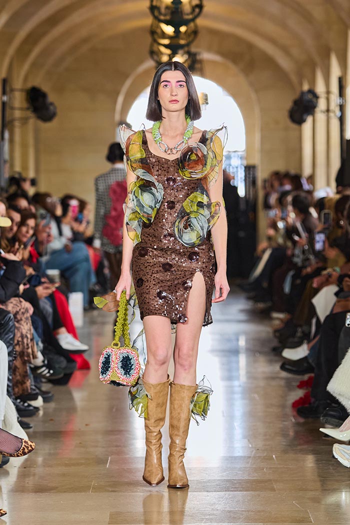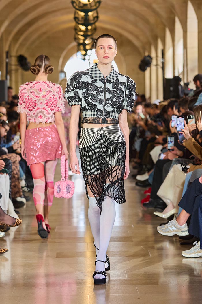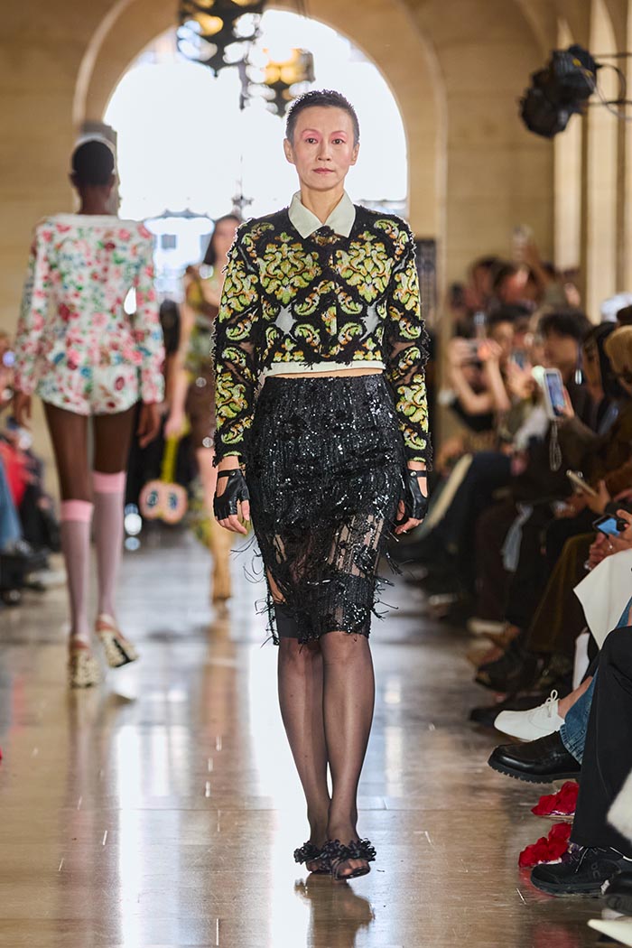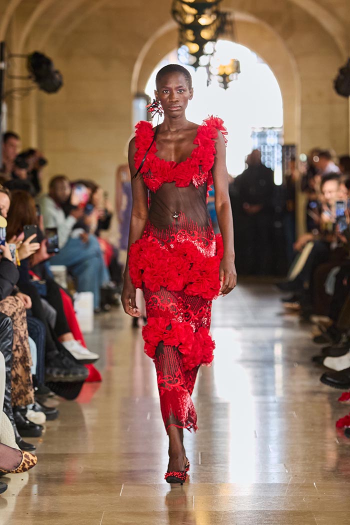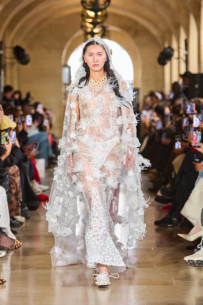 Em meio a essa paleta vibrante, o preto e o branco surgem como contrapontos dramáticos, simbolizando sombra e luz, força e vulnerabilidade. Qiu conduz essa dualidade com maestria, equilibrando o lúdico e o sofisticado, o artesanal e o experimental. Os laços, flores em relevo e transparências revelam um diálogo entre tradição e modernidade, onde cada detalhe se transforma em expressão de coragem e sensibilidade.